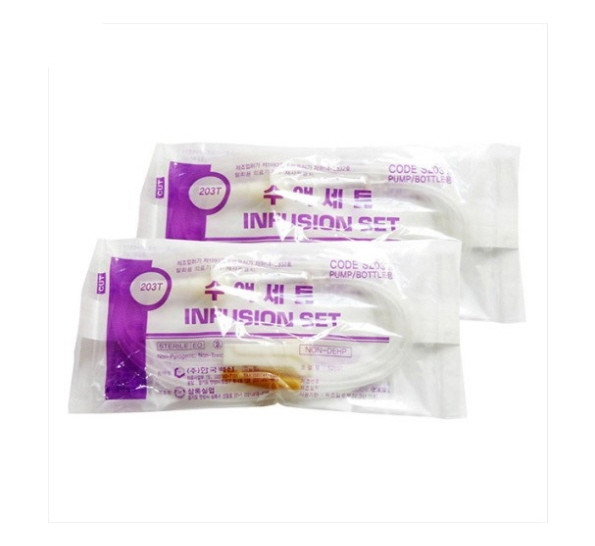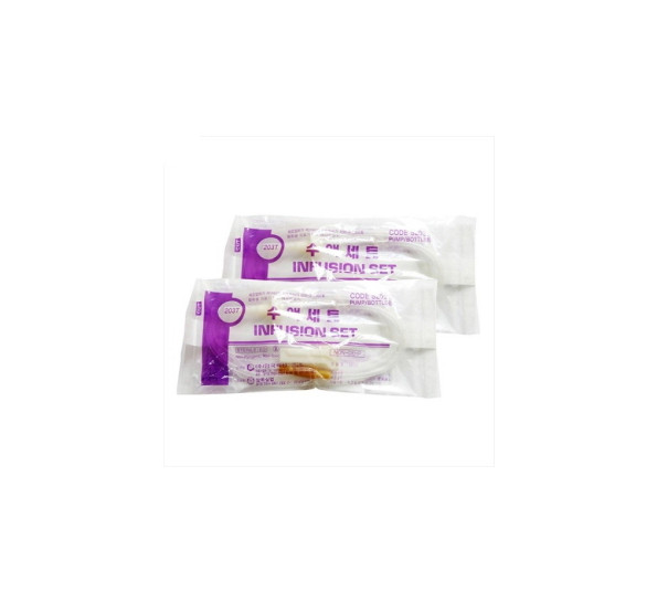 - 포장을 개봉하고 도입침 캡을 벗기고 수액용기에 꽂는다.